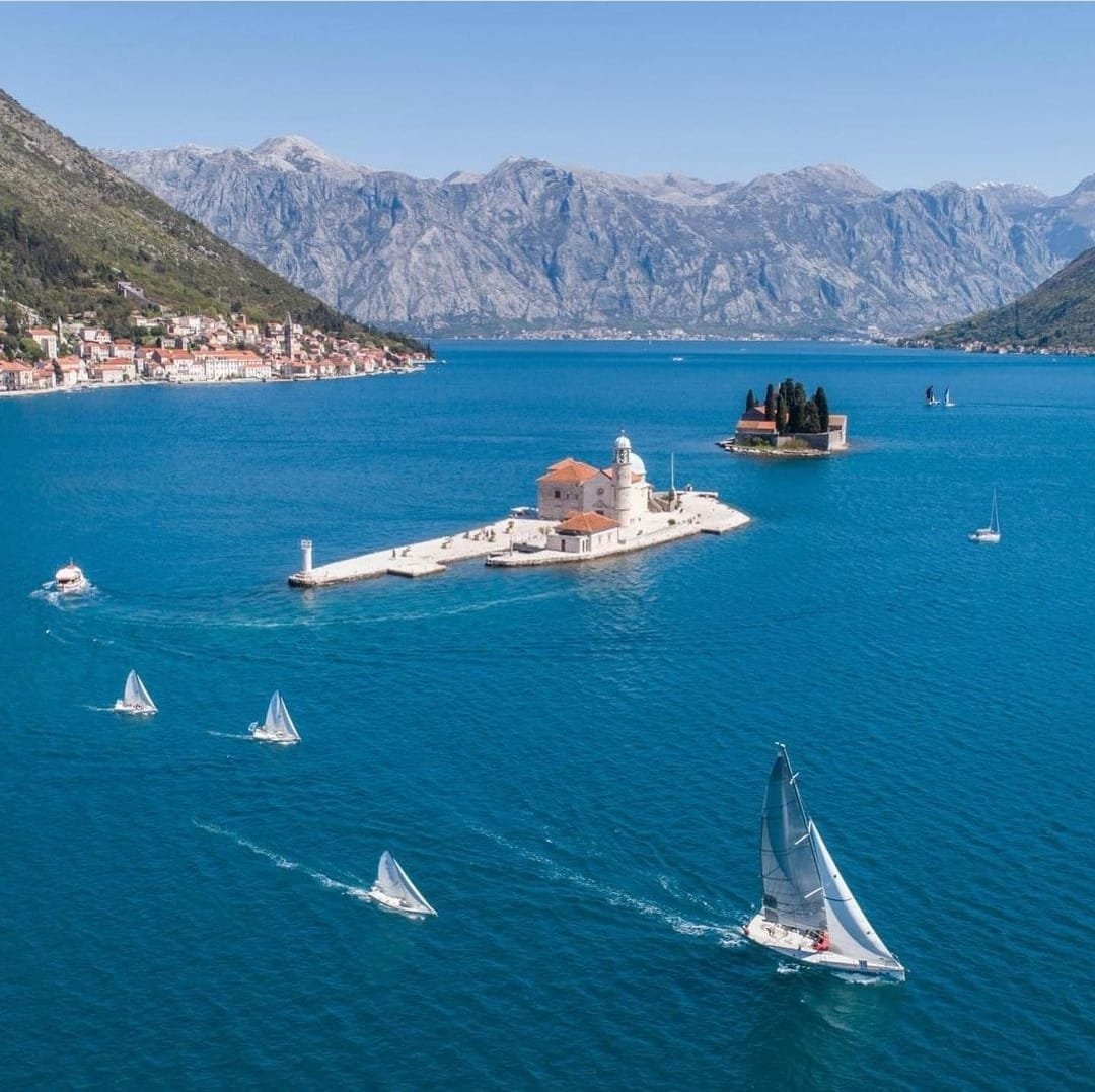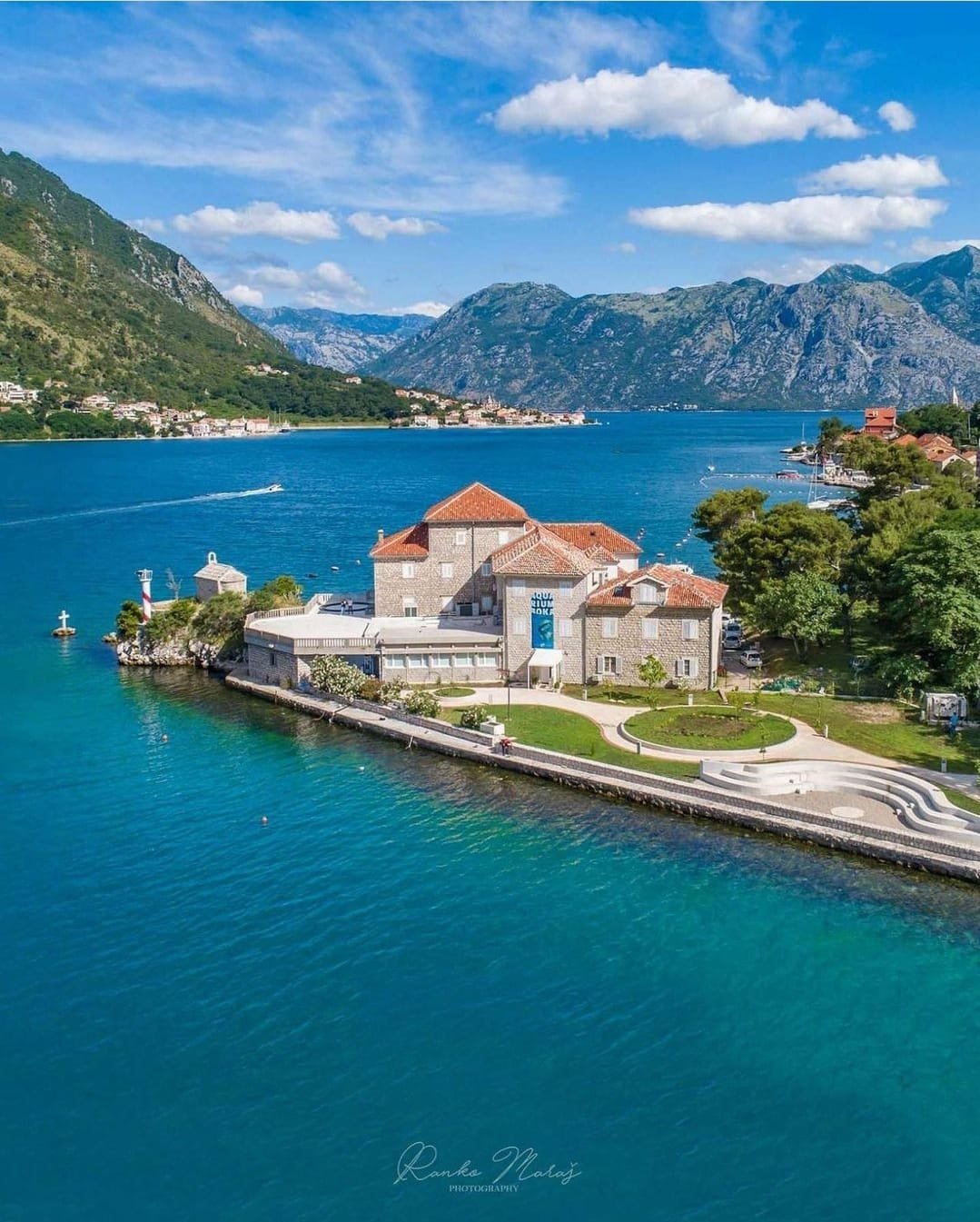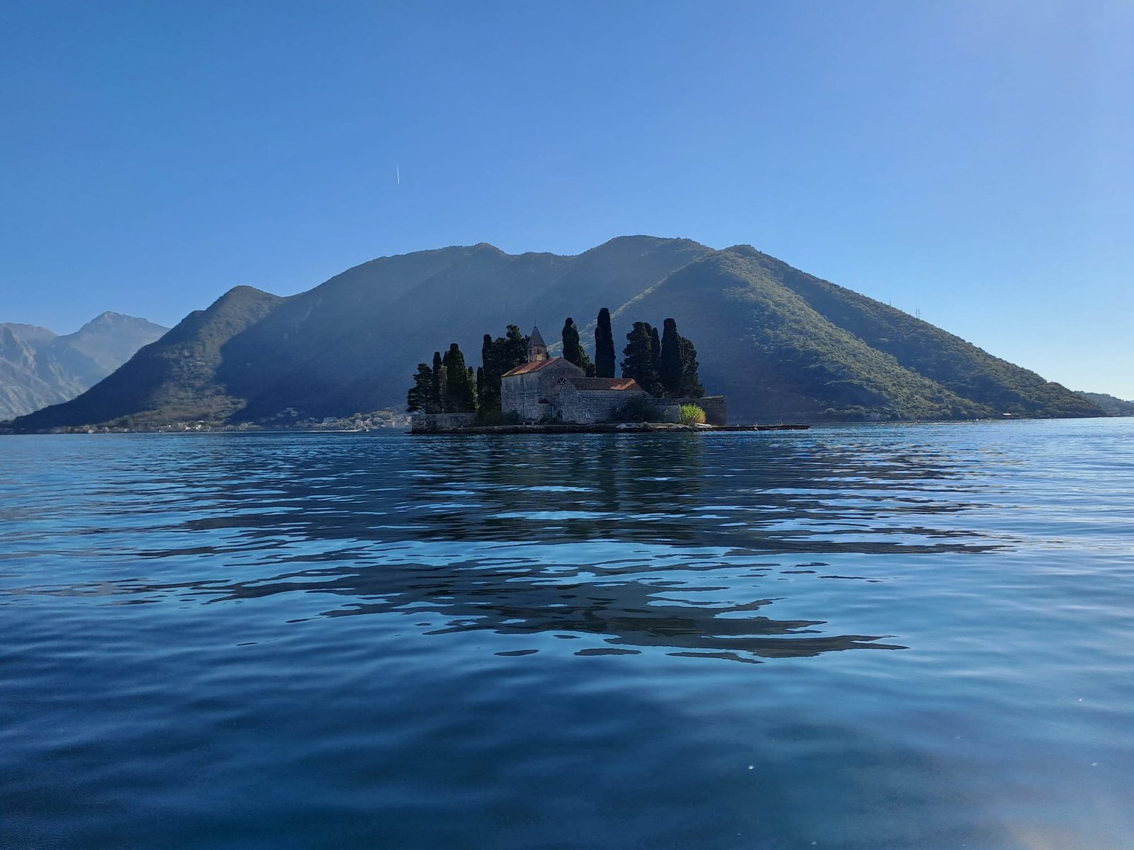 Beautiful St. George Island in Perast, Montenegro, under a sunny blue sky